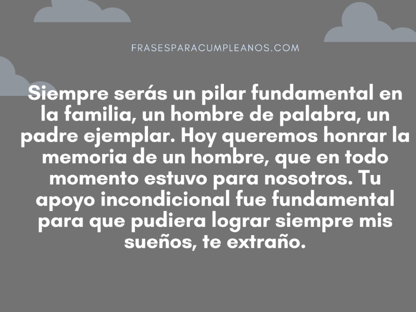 En este día tan especial, querido padre, te prometemos honrar tu memoria viviendo conforme a tus enseñanzas y valores. Seguiremos tu ejemplo de amor incondicional, generosidad y respeto hacia los demás. Cada paso que demos en la vida será un tributo a ti, porque tu legado vive en cada uno de nosotros.