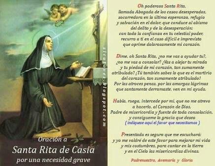 "Oh gloriosa Santa Rita, abogada de los imposibles, intercede en este momento por mí ante Dios Todopoderoso. Tú, que en vida fuiste ejemplo de fortaleza y perseverancia en medio de las dificultades, te ruego que me acompañes en mi situación actual.